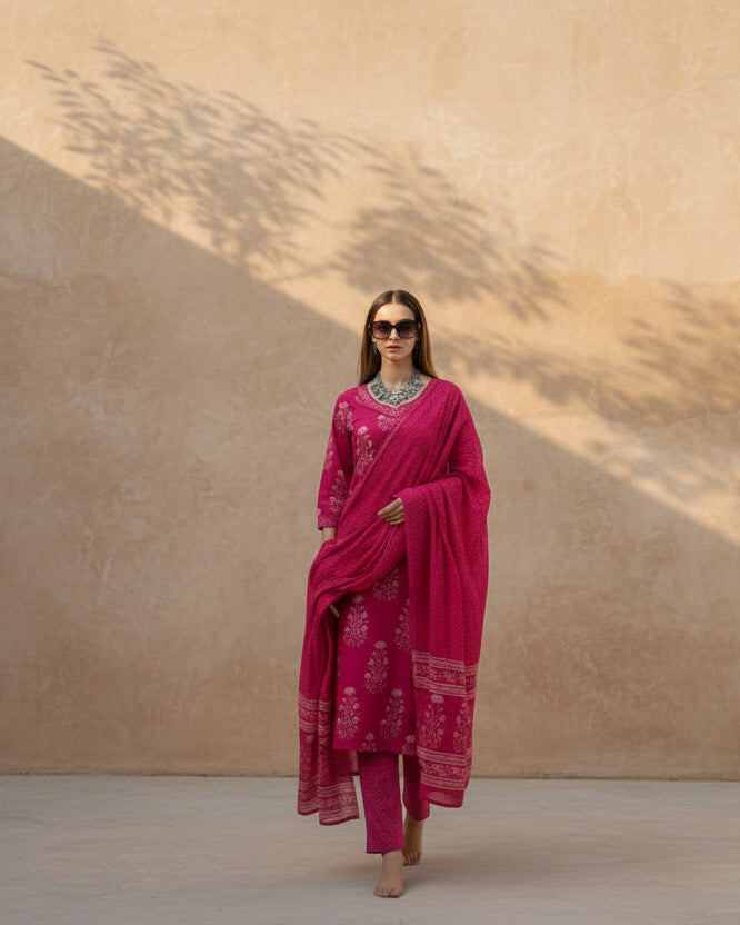 Vibrant Pink Paisley Embroidered Kurta & Pant Set