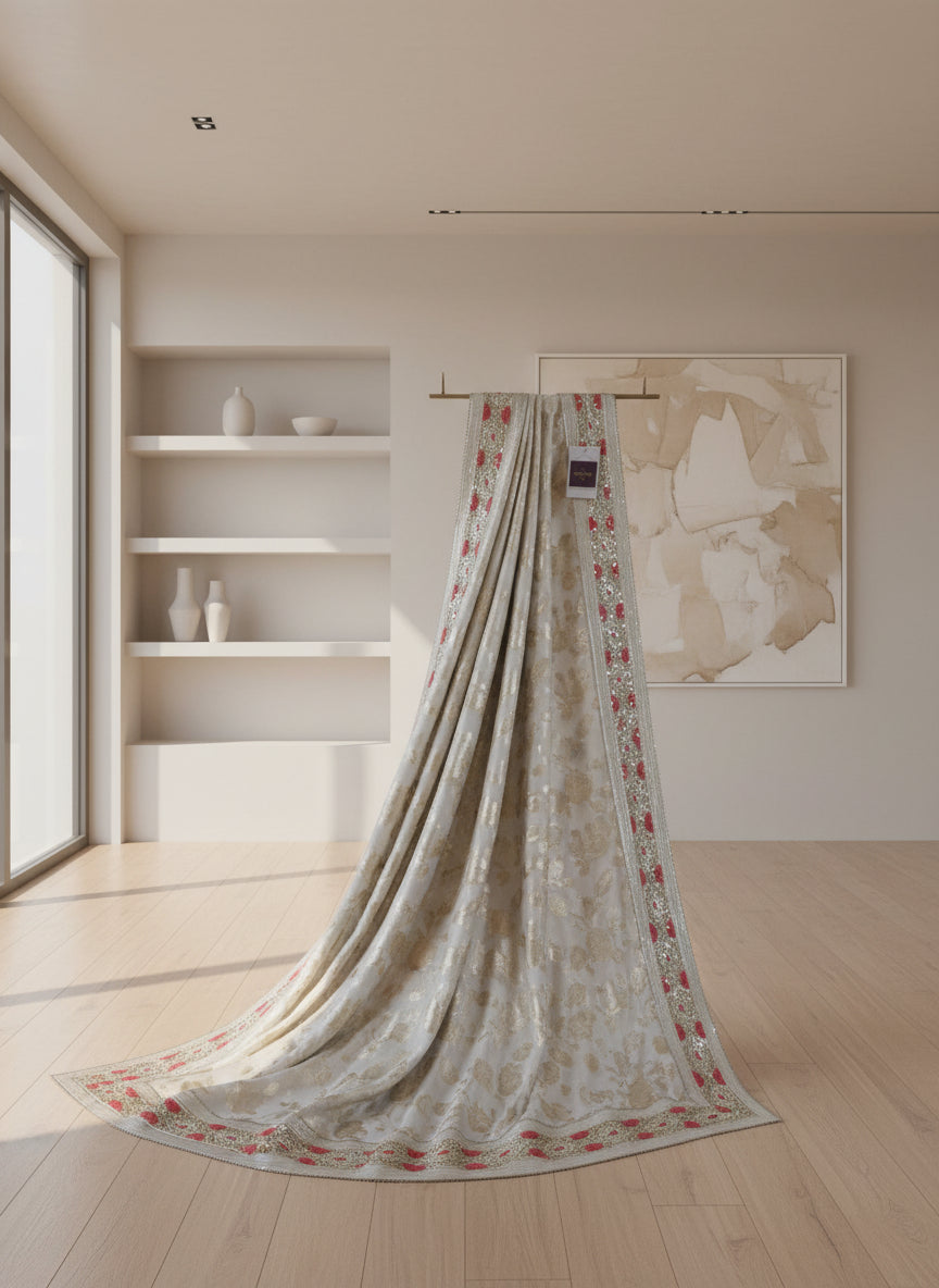 Unstitched elegance in hues of rose pink and silver, detailed with geometric zari work that reflects subtle sophistication.