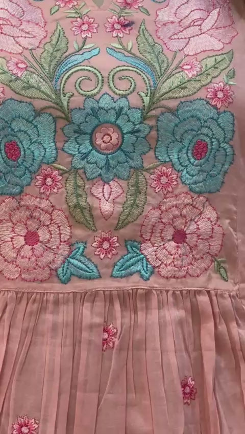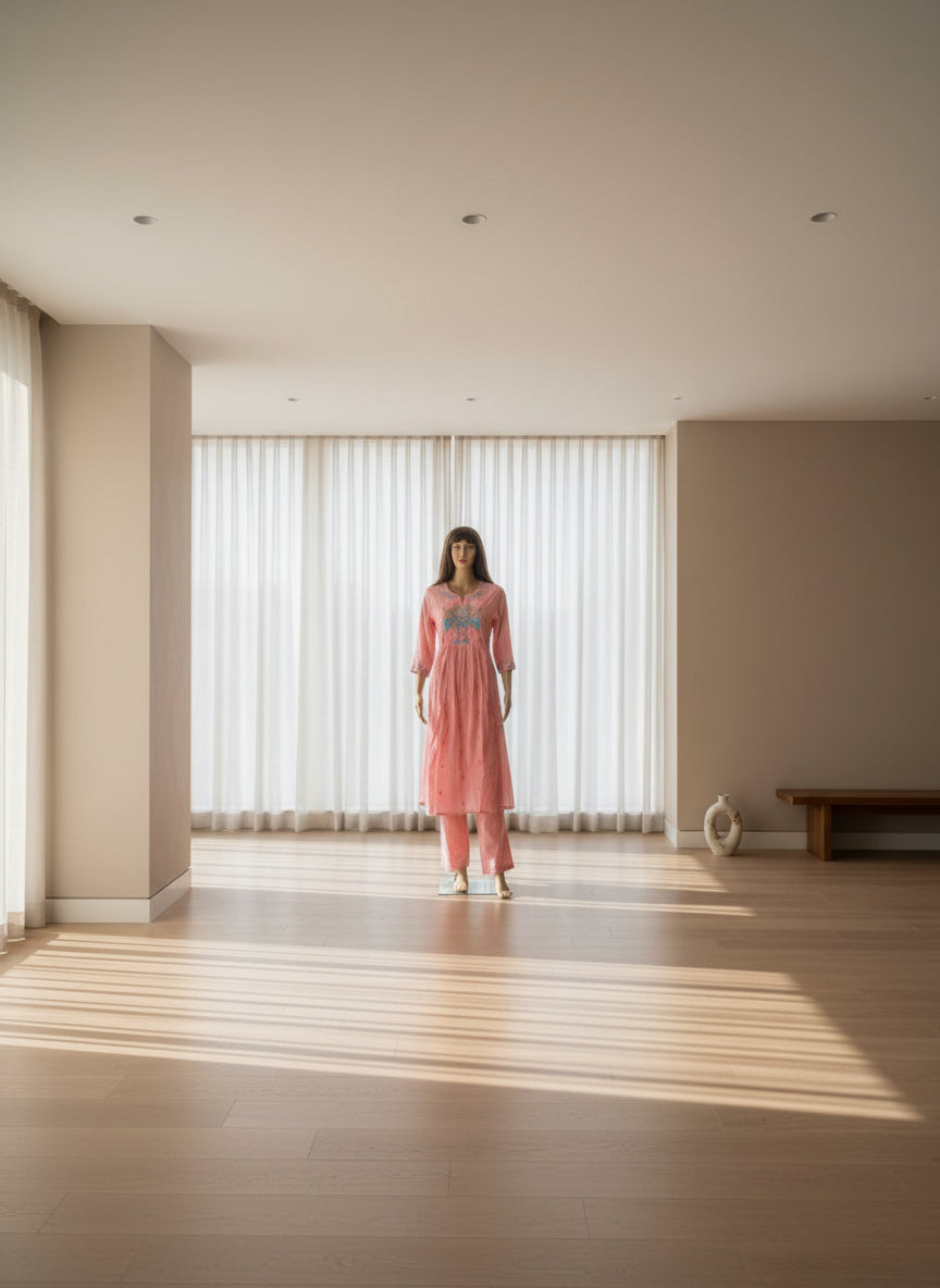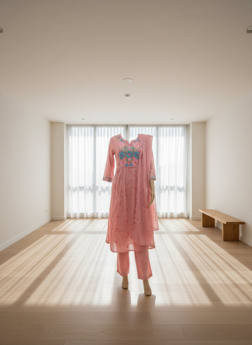 Graceful, feminine and beautifully detailed â this pink embroidered kurta set is a celebration of delicate charm. The hand-embroidered floral motifs in soothing pastel tones bring a refreshing burst of color, while the soft fabric drapes effortlessly, giving you comfort from morning to evening. Subtle gathers and scalloped finishing add movement and flow, making this set perfect for brunch dates, poojas, festive mornings, or simply a day when you want to feel effortlessly beautiful.