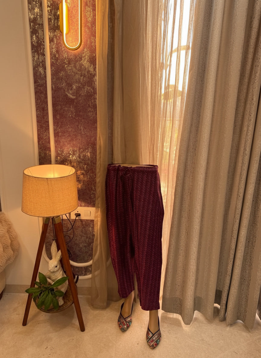 Wrapped in the depth of wine and adorned with timeless floral block prints, this kurta set brings together heritage charm and effortless elegance. The colour itself exudes warmth, luxury, and quiet sophistication—perfect for moments when you want to stand out without being loud. The matching dupatta and bottoms complete the story with harmony and fluidity, while the lace-detailed neckline adds a soft, feminine touch. Whether it’s a festive get-together, a cosy evening, or a special day at work, this set makes you feel beautifully put-together with minimal effort.