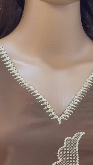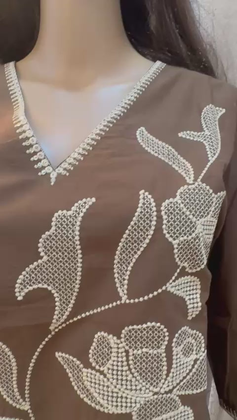 Rich, earthy, and effortlessly graceful â this brown embroidered kurta set is the embodiment of understated luxury. The soft cotton fabric drapes with ease, while the intricate white thread embroidery adds a touch of artistry to the warm, chocolate-toned base. Designed for women who appreciate elegance without excess, this set transitions beautifully from everyday sophistication to intimate festive gatherings. It carries a charm that is grounded yet refined â a true celebration of subtle beauty and timeless tradition.