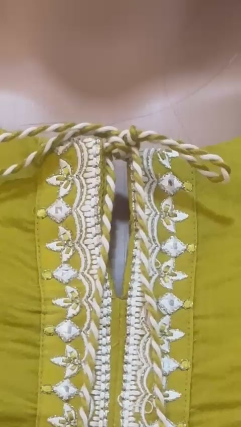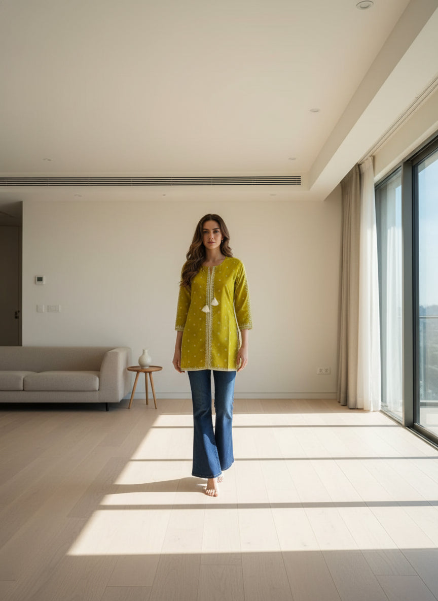 Radiating sunshine and cheer, this mustard yellow short kurti captures the spirit of effortless style. Adorned with delicate white thread embroidery and playful tassels, it strikes the perfect balance between simplicity and charm. The intricate lace detailing along the neckline and sleeves adds a soft feminine touch, making it ideal for casual outings, workdays, or coffee catch-ups. Breezy and beautifully tailored, this kurti brings everyday elegance to life with a vibrant twist.