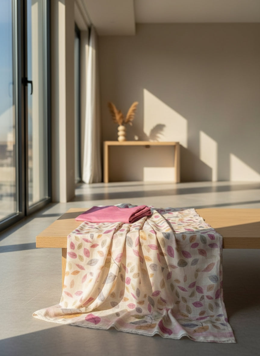 Drift into the calm of pastel mornings with this beautifully printed kurta set. The gentle leaf motifs bloom across the fabric like nature’s own watercolor strokes—subtle, soothing, and effortlessly graceful. Paired with a solid pink bottom, the set blends charm with comfort, making it perfect for days when you want your outfit to feel light, airy, and uplifting. Whether it’s a relaxed brunch or a peaceful workday, this ensemble wraps you in a soft, dreamy elegance that never tries too hard, yet leaves a lasting impression.