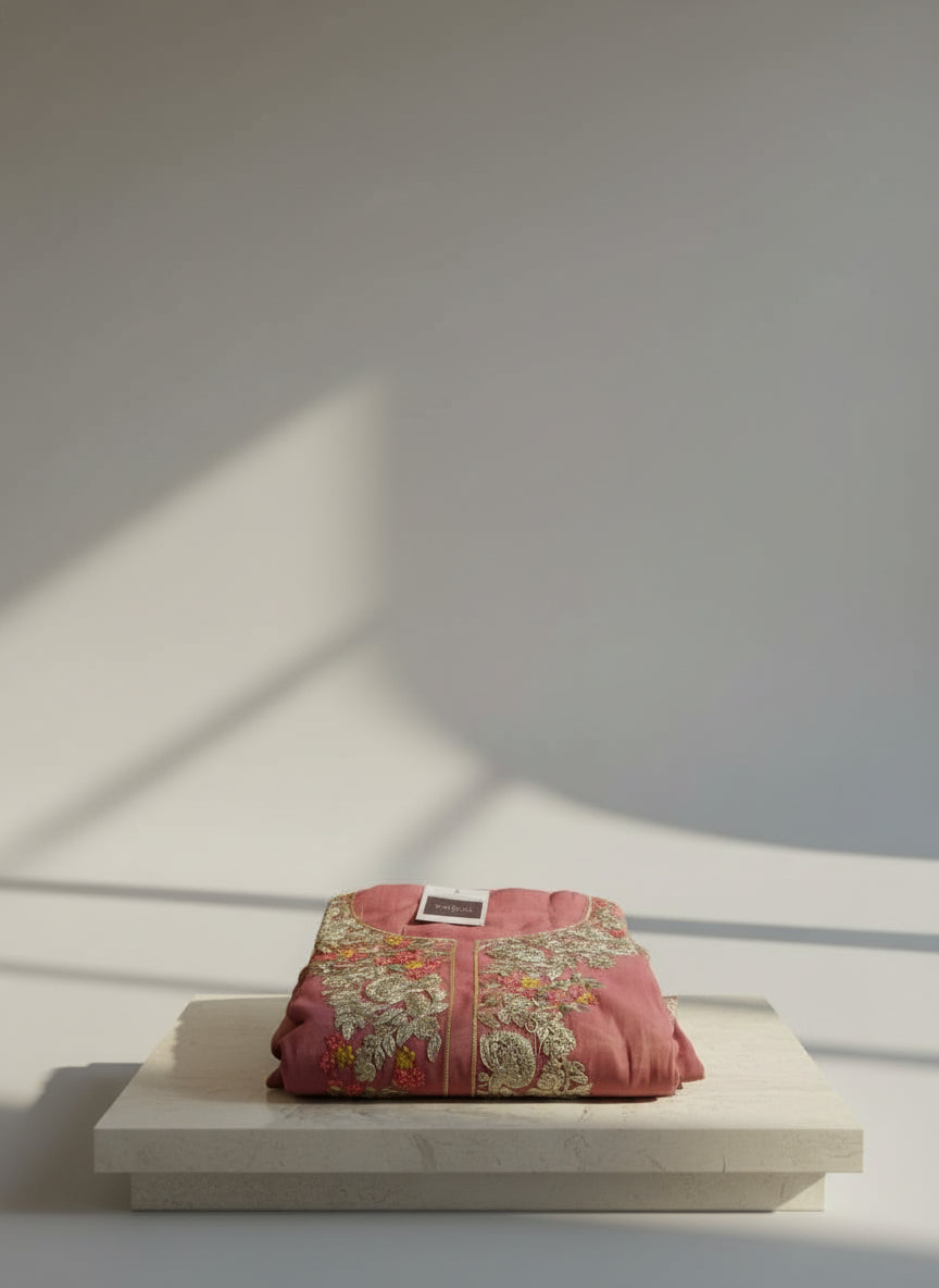 Wrapped in the charm of Gajari pink, this kurta set is a celebration of timeless craftsmanship. The richly embroidered floral motifs bloom in threads of gold, green, and hints of vibrant redāeach detail adding depth, sparkle, and artistry to the ensemble. The fabric carries a natural sheen that elevates the look without trying too hard, making it perfect for festive gatherings, family functions, or elegant evenings. This is a piece that speaks softly, yet leaves a lasting impressionāgraceful, feminine, and beautifully refined.