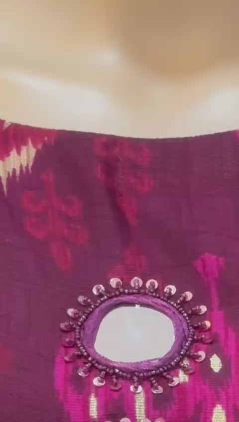 Drenched in the allure of deep wine hues, this kurta palazzo set is where tradition meets contemporary elegance. The geometric print in warm tones of gold and pink adds a playful vibrance, while the statement mirror accents on the neckline bring just the right touch of shimmer. Designed for the modern woman who loves comfort with sophistication, this ensemble is perfect for festive gatherings, family dinners, or cultural celebrations. With its rich palette and timeless design, it’s an outfit that exudes grace, confidence, and charm in every detail.